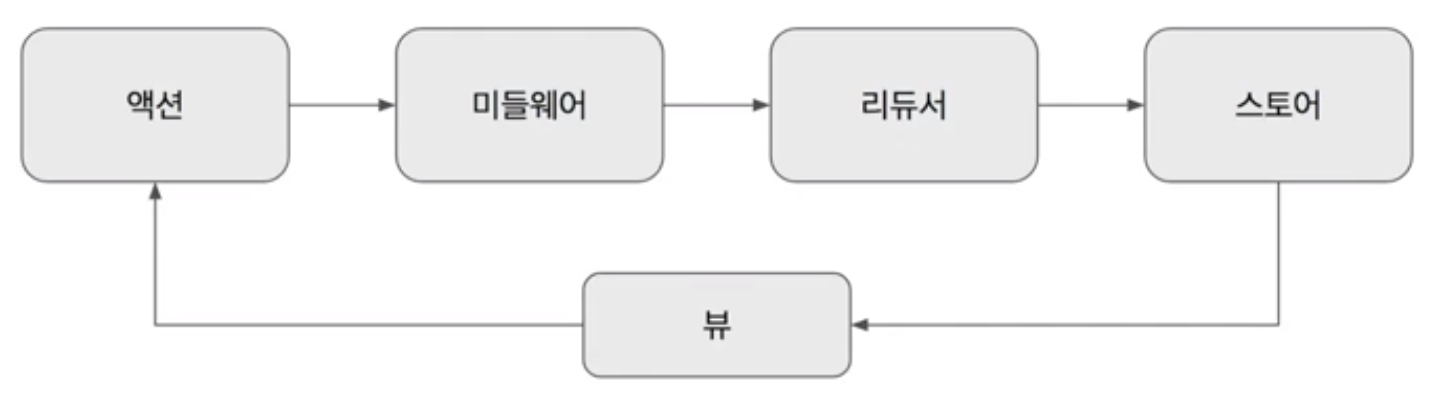 먼저 뷰 쪽에서 상태값을 변경하고 싶을 때 액션을 발생 시키고, 그 액션을 미들웨어가 처리를 하고,(미들웨어에 원하는대로 여러가지 기능을 넣을 수도 있다 안넣었으면 따로 처리하는것은 없다) 처리를 하면 리듀서에서 액션에 의해 상태값이 어떻게 변경되는지 처리하는 로직을 담고 그로직에 의해 처리를 한다. 리듀서에서 처리를 하면 새로운 상태값이 되고 그 새로운 상태값을 스토어가 저장을 하고 뷰에게 알려준다.
