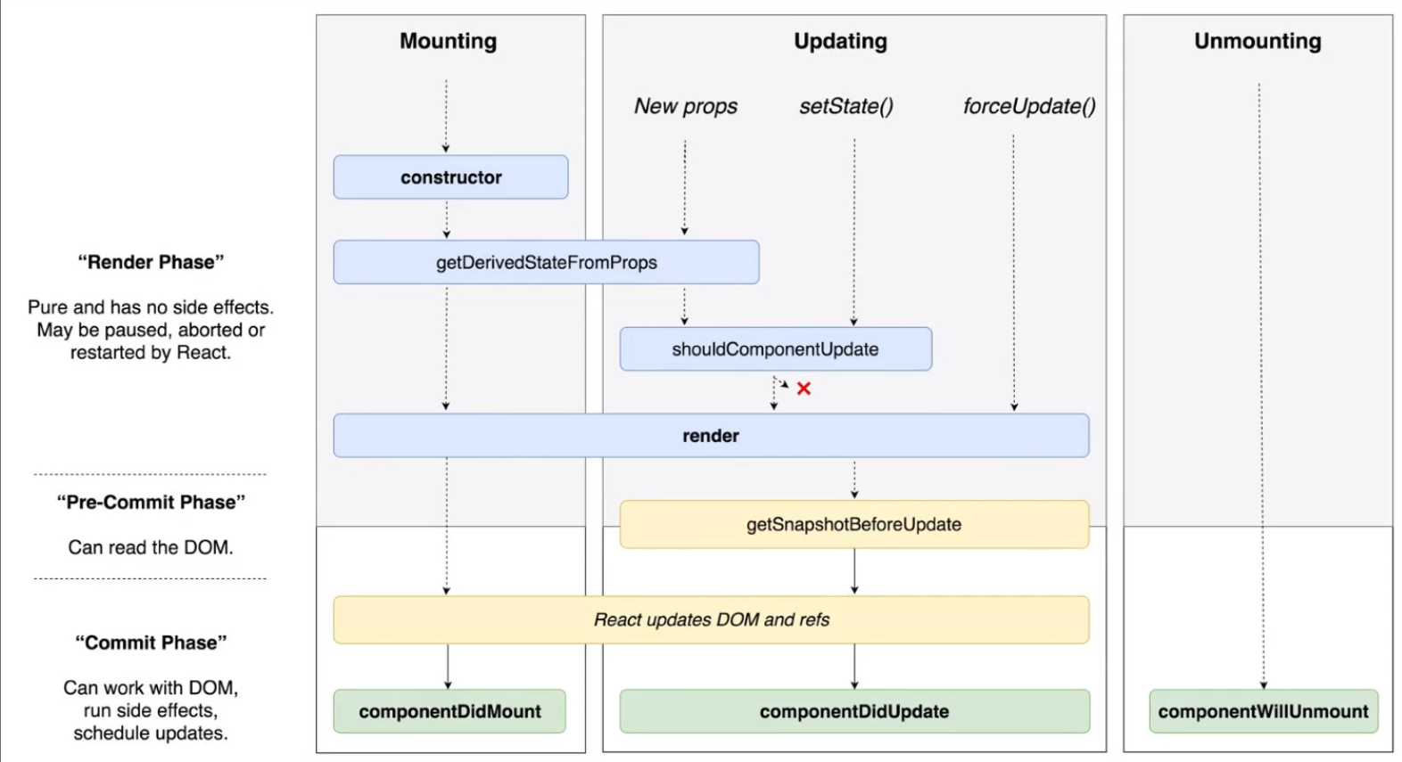 ->4. getSnapshowBeforeUpdate : 실제 랜더링 한 다음에 결과물이 브라우져에 반영되기 직전에 이 함수가 호출된다.